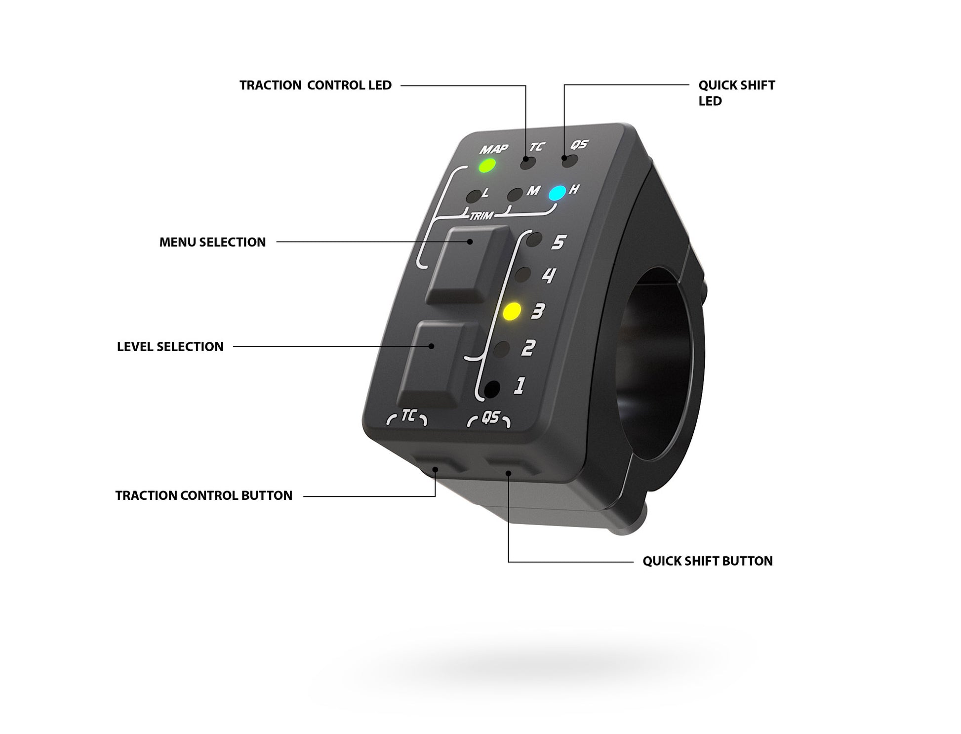 The AIM Handlebar Switch 2 (HBS2) is a compact, handlebar-mounted control interface designed for the Taipan ECU series, featuring 2 pushbuttons and 10 LEDs for on-the-fly adjustments. It enables riders to toggle between up to 5 selectable maps, apply fuel corrections across low/mid/high RPM ranges, activate and fine-tune traction control (with 5 strength levels), engage launch control for optimized starts, and utilize the LEDs as a shift light module that blinks at preset RPM thresholds for gear changes. Built with a waterproof JST connector, PA6 + 30% glass fiber body, IP65 rating, and weighing just 70g, it's plug-and-play compatible with Taipan ECUs on off-road and motocross bikes, enhancing performance tuning flexibility without stopping.